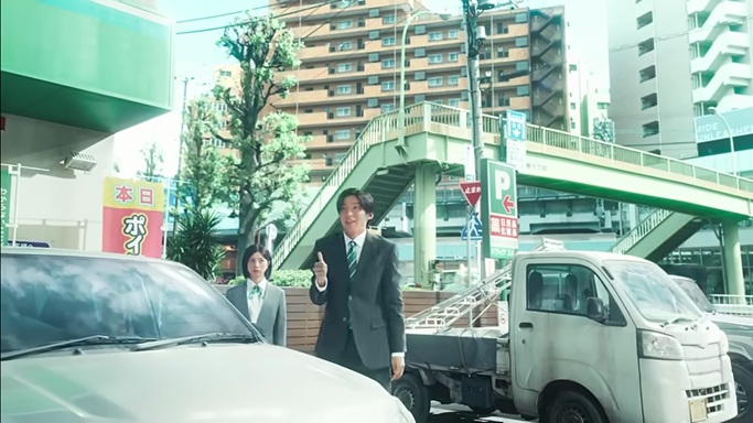 営業マン役の目黒蓮さんがドラッグストアでお客さんに「お願いします、お願いします」と念を送る演出と、「先輩の祈りは一ミリも関係ない」という桜田ひよりさんのナレーション。