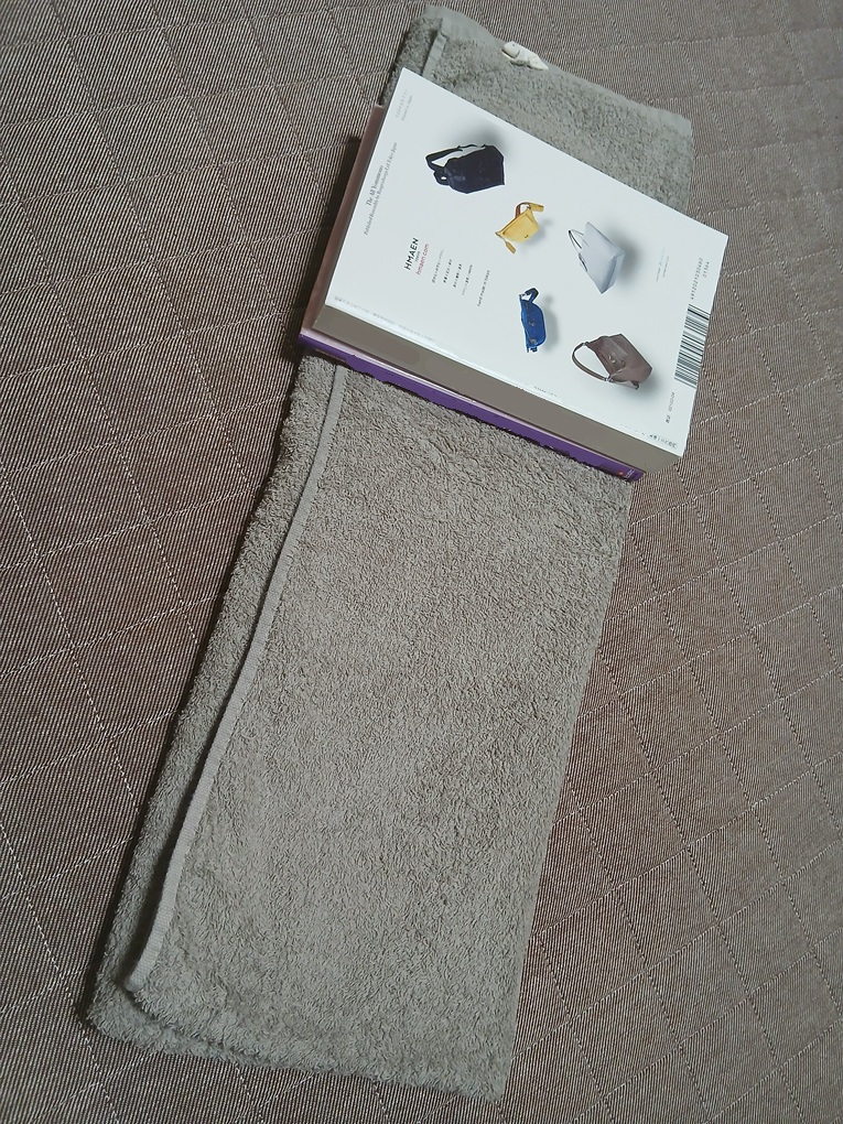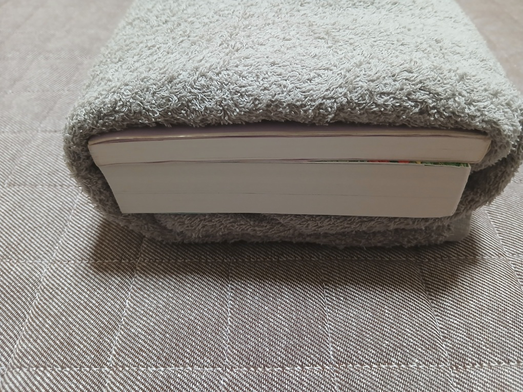 ①バスタオルを本の幅に合わせて細長く畳んだ上に、本(または雑誌)を好みの高さに重ねる。