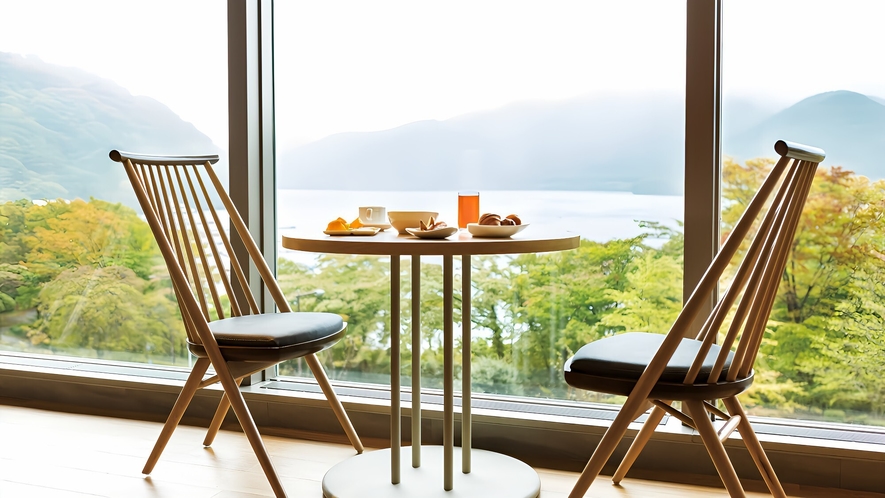 まるで芦ノ湖と一体化したかのような錯覚を覚える水場の中心に丸いソファーとテーブル。