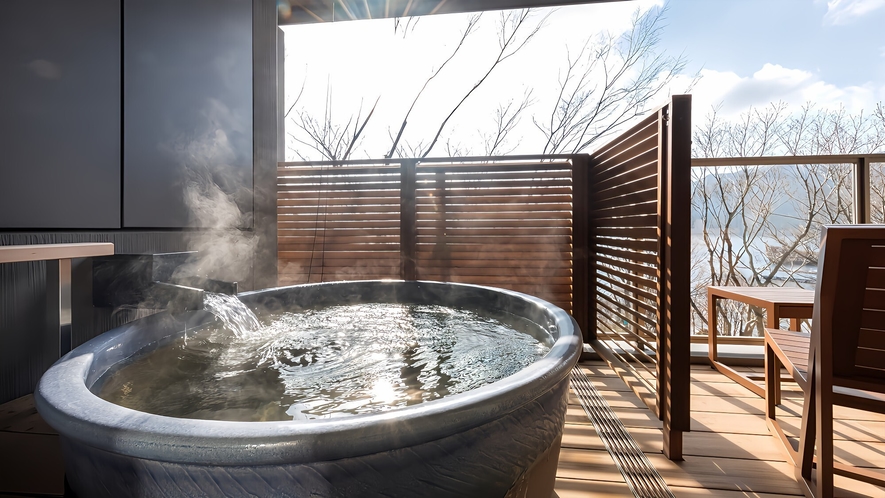 露天風呂つきのリラックスルームは、お湯につかりながら芦ノ湖の景色を堪能できる。