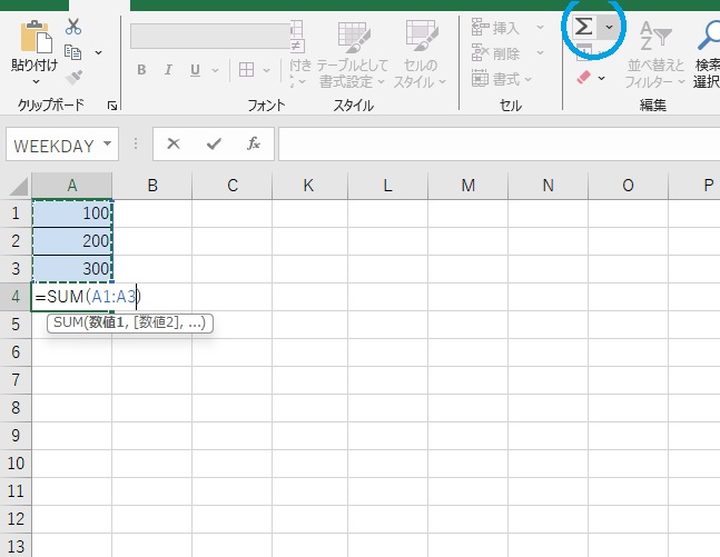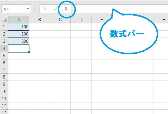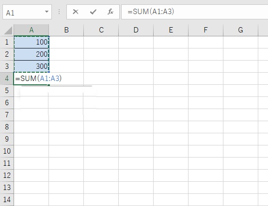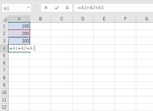 A1、A2、A3にそれぞれ100、200、300と入力した数字の合計をA4のセルで計算したい。