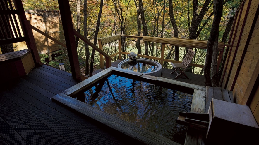 鬼怒川プラザホテルから徒歩数分の場所に位置する、離れ風に建てられた温泉情緒豊かな貸切露天風呂です。