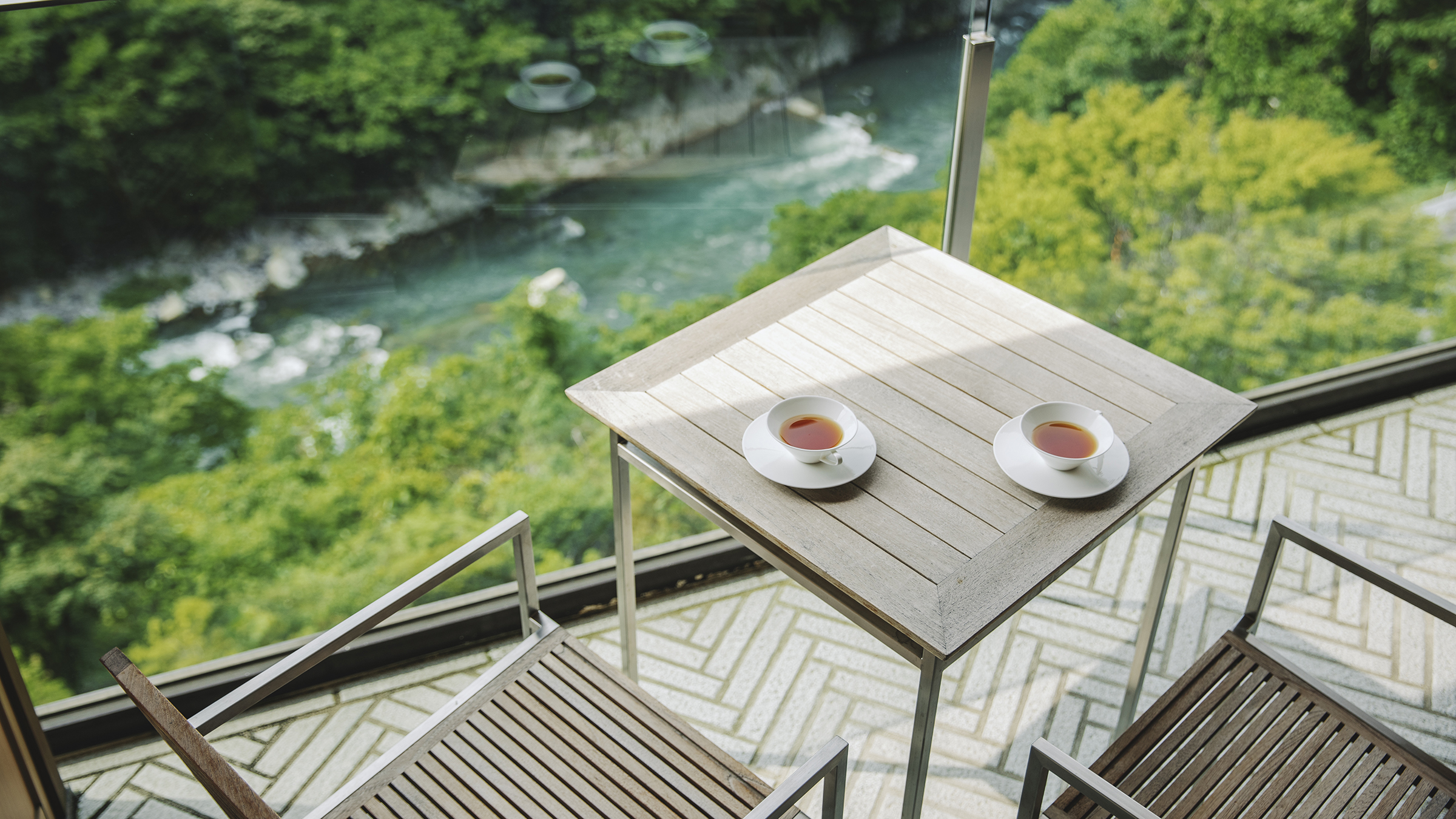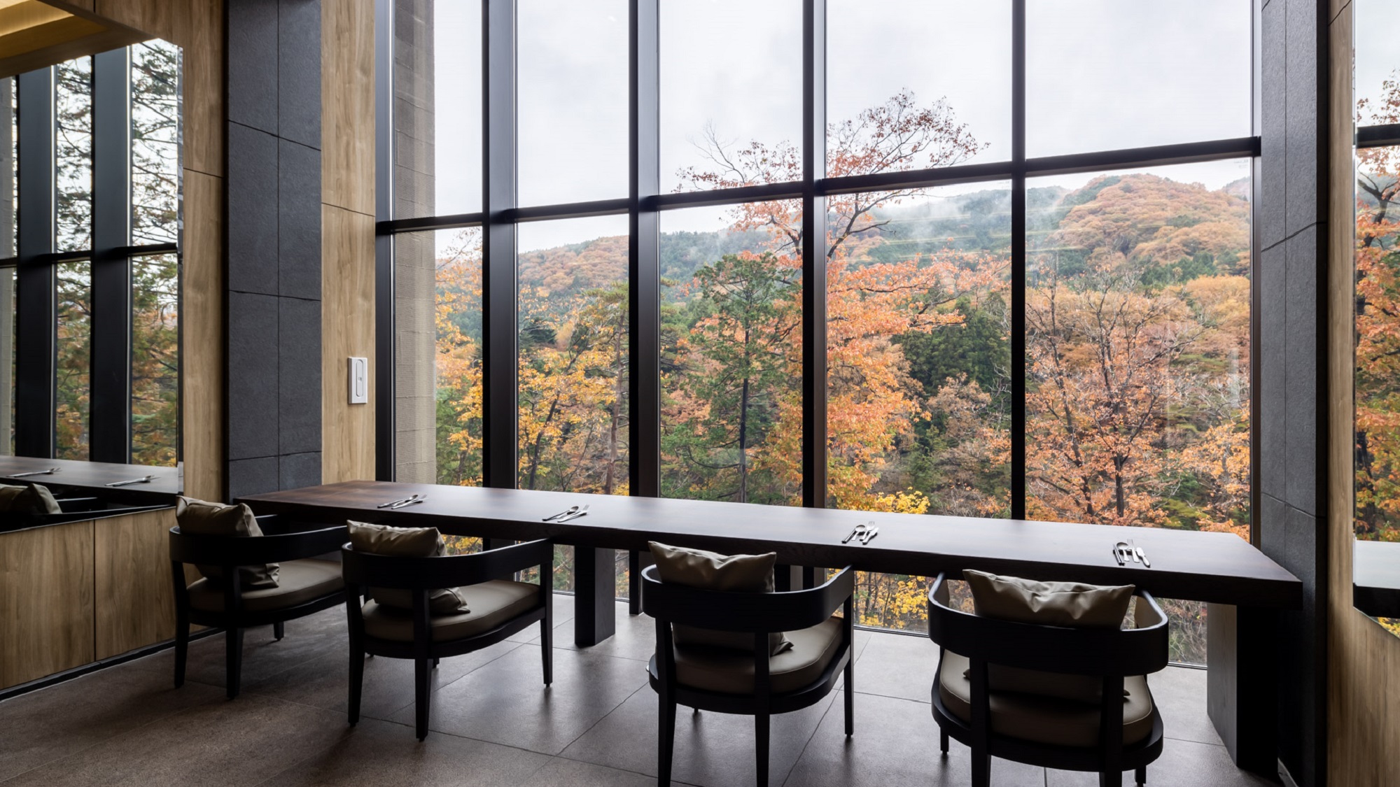 ホテルのエントランスを抜けると、鬼怒川渓谷の雄大な自然が、窓の向こういっぱいに広がります。