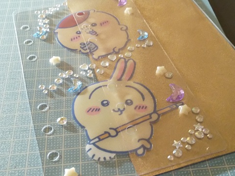 デザインカッターでカットした「ちいかわ」のイラスト(元はキャンドゥで買ったミニサイズのファイル)。周りにキラキラシール。