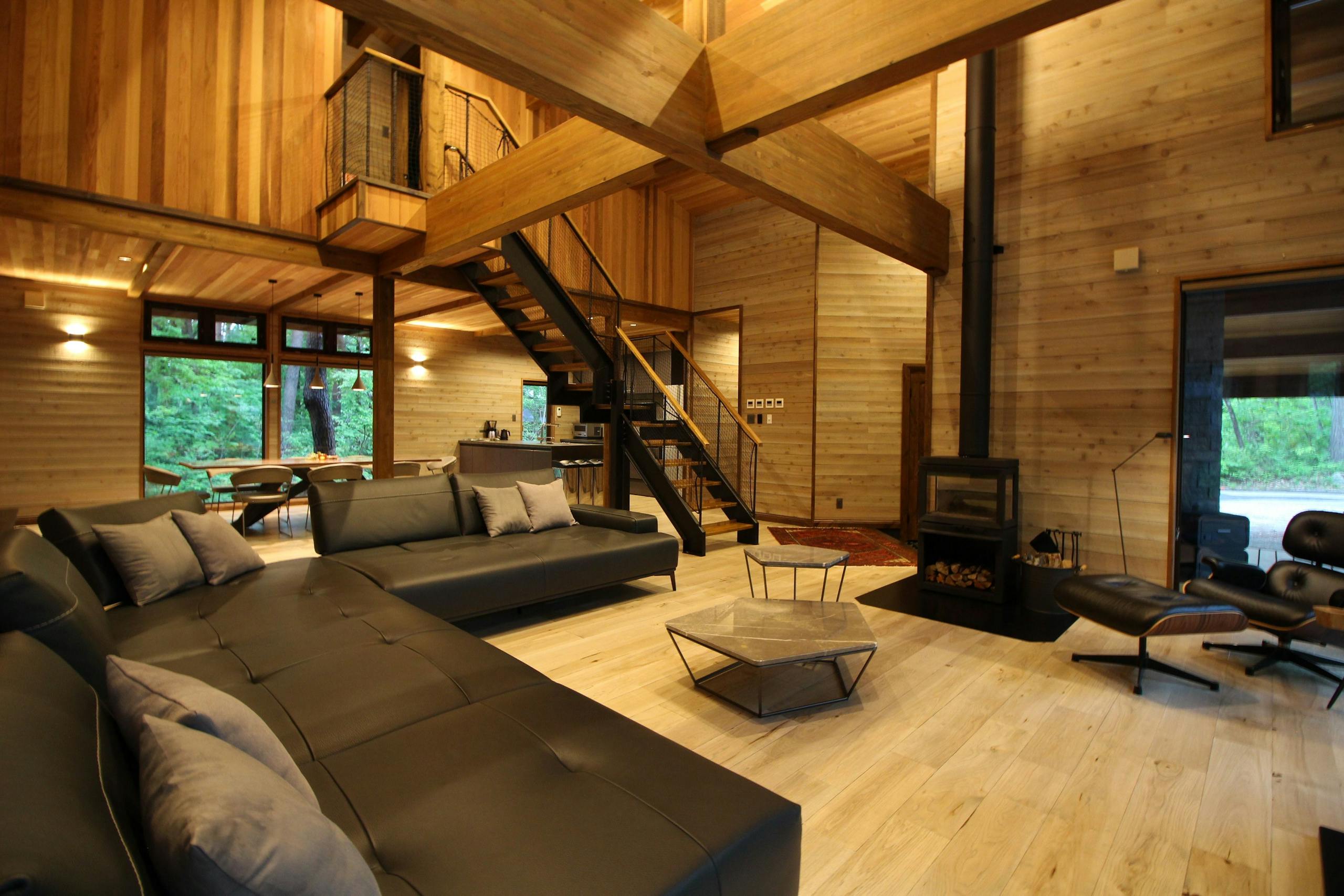 玄関を開けると吹抜けと暖炉を設えた広いリビング。外壁、内壁、天井もすべてカナダのウエスタンレッドシダー、床材はカナダのオールドヒッコリーの無垢材を使用。